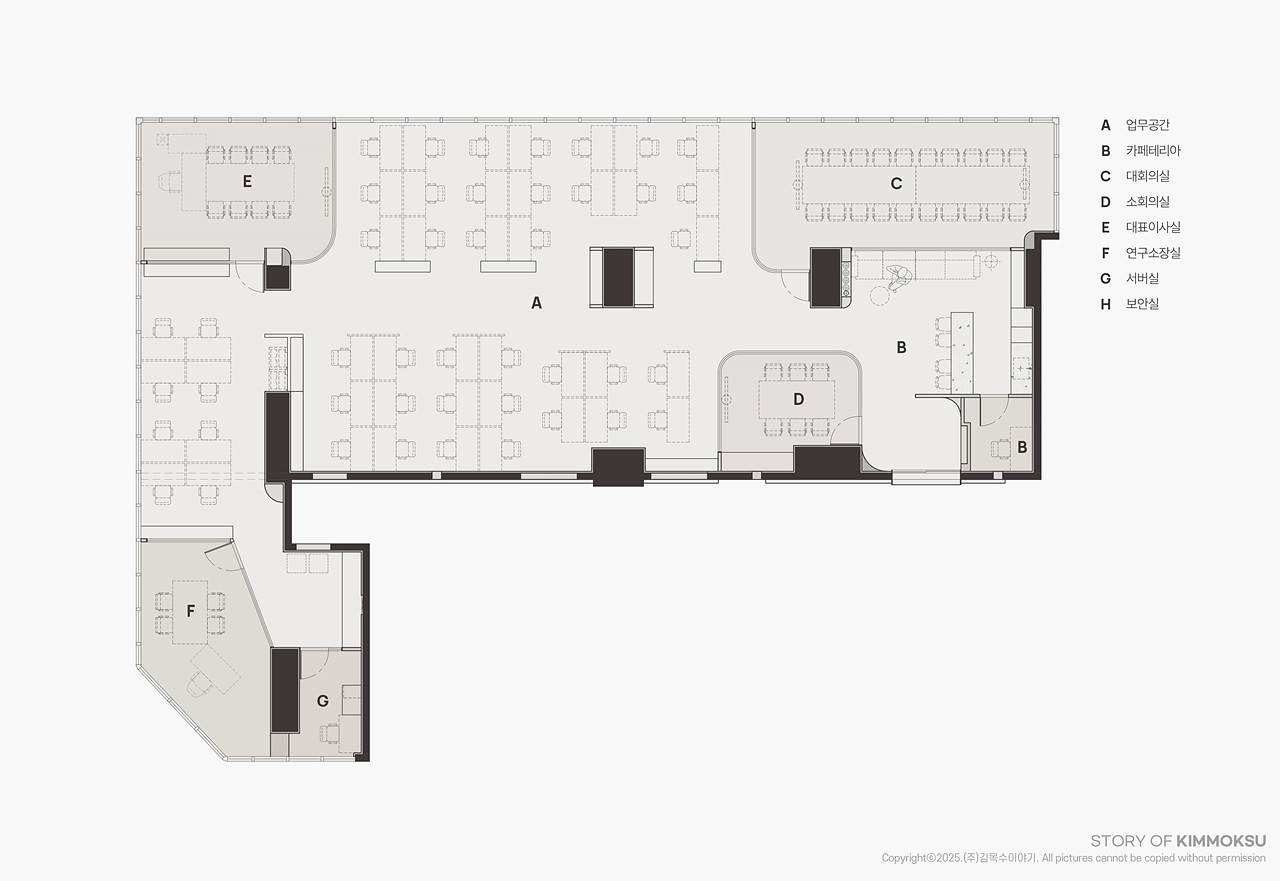 구 성 업무공간, 카페테리아, 대표이사실, 경영관리,