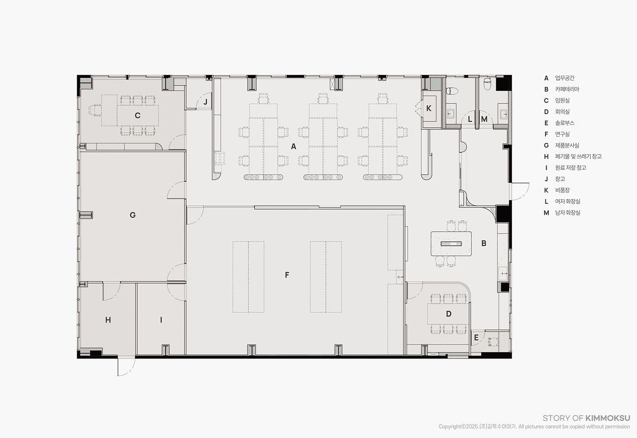 프로젝트가 진행된 공간은 오래된 공장 건물로 김목수이야기는 공장 건물이 가진 확장감을 그대로 가져가면서 구성원들이 불필요한 동선 낭비를 하지 않는 레이아웃을 고민했습니다. 특히 이 건물은 내부와 계단이 완전히 분리된 형태라 2층과 3층을 오갈 때마다 외부 계단실을 통해야 하는 불편함이 있었습니다. 설계팀은 이를 해결하기 위해 ''각 층의 기능을 분리하는 전략'을 선택했습니다. 단절된 동선을 약점으로 보기보다, 층별 기능을 분리하여 집중도가 높아지는 구조로 재해석하였는데요. 2층은 연구 · 개발 중심의 업무 공간으로, 3층은 휴식과 커뮤니케이션을 담은 라운지 공간으로 각 층의 테마를 설정한 후 디테일한 레이아웃을 설계해 나갔습니다. 오래된 공장에서 시작된 사옥 리뉴얼은 함일셀레나가 앞으로 나아갈 방향을 시각적으로, 공간적으로 심도 깊게 담아내는 과정이었습니다. 미래의 기술을 그린 사옥을 통해 기업은 정체성을 더욱 명확하게 드러내고, 새로운 브랜드 경험을 만들어갈 것입니다.