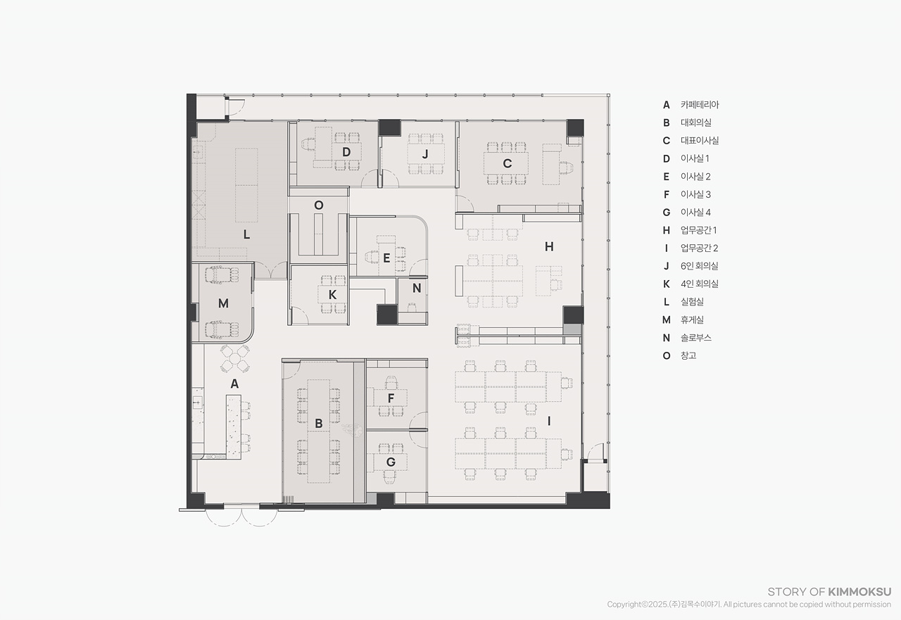 서로 다른 업무 환경이 공존하는 오피스라면 각 공간이 독립성을 유지하면서도 업무 흐름은 자연스럽게 이어져야 합니다. <삼덕에프지> 오피스는 바이오 산업 관련 기업 특성상 사무공간과 실험공간이 함께 필요한 환경으로 135평 안에 15개의 공간을 효율적으로 연결하는 레이아웃이 핵심이었습니다. 먼저 전체적인 분위기는 베이지 톤을 중심으로 차분하고 안정적인 디자인으로 완성되었습니다. 입구 가까이에 카페테리아와 대회의실을 배치해 소통 중심의 공간으로 구성되었으며 폴딩도어를 적용해 상황에 따라 분리와 확장이 가능하도록 했습니다. 실험실은 장비 반입을 고려해 양개도어로 계획하고 창고를 실험실과 사무공간 사이에 두어 불필요한 이동은 최소화하고 양쪽으로 출입이 가능하도록 구성했습니다. 이는 실험공간과 사무공간을 분리하면서도 동선 흐름을 자연스럽게 이어주는 전략적 배치입니다. 업무공간은 두 팀이 함께 근무하는 업무형태에 맞춰 구역을 나누되 이동형 하부장을 적용해 향후 팀 인원 변화에도 유연하게 대응할 수 있도록 해주었습니다.