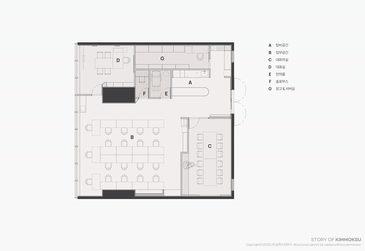 이번 부산 사무실은 이러한 김목수이야기의 철학을 직접 담아낸 공간이자 새로운 시작을 의미하는 프로젝트입니다. 부산 남구에 위치한 BIFC2 지식산업센터로 사무실을 이전하며, 약 54평 규모의 공간에 6명의 직원이 근무할 수 있는 업무 환경을 계획했습니다. 여유로운 업무 공간을 중심으로 회의실, 카페테리아, 솔로부스, 창고 등 업무에 필요한 다양한 요소를 구성해 실제 김목수이야기 업무 방식에 맞춘 사무실로 완성했습니다.
