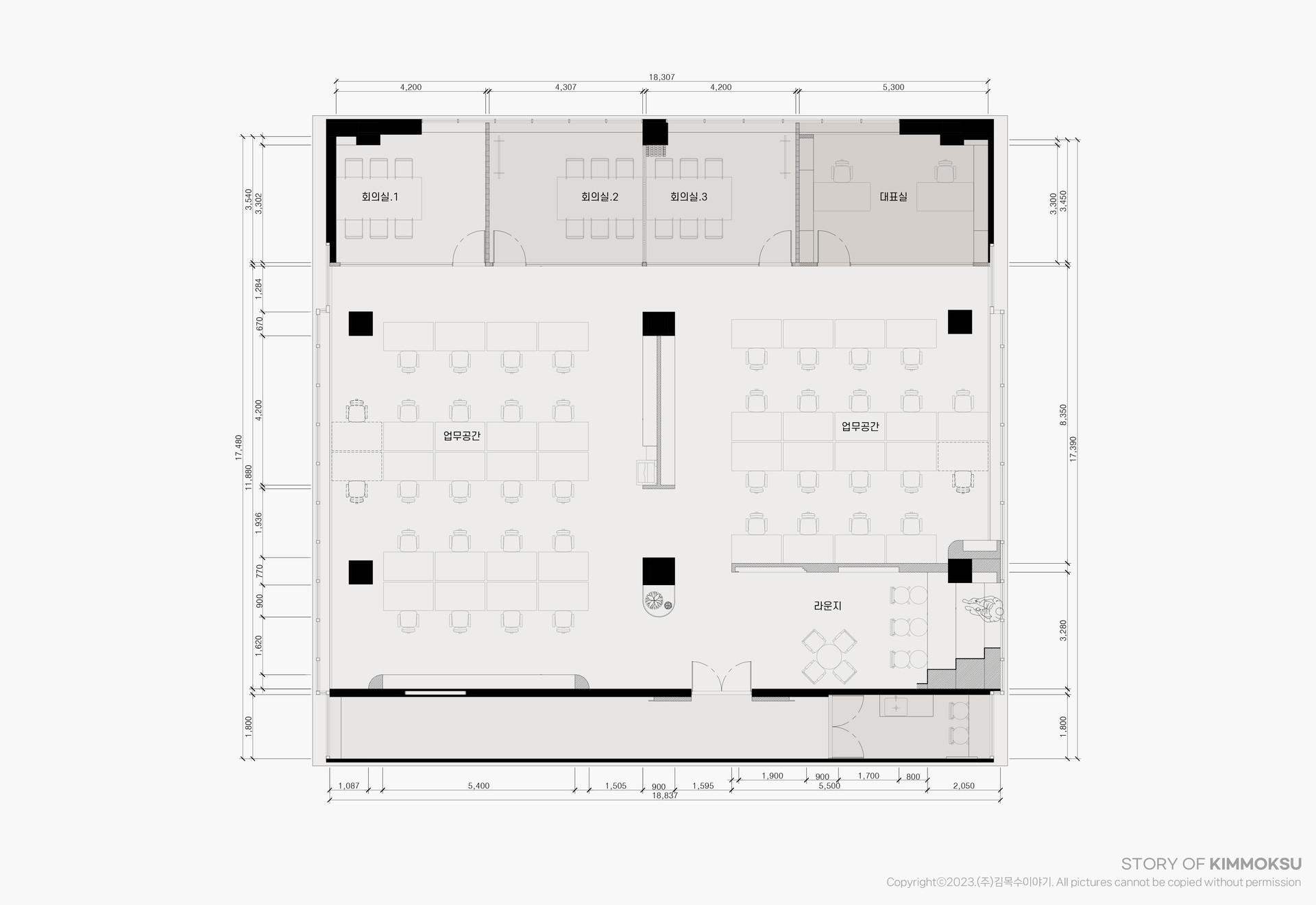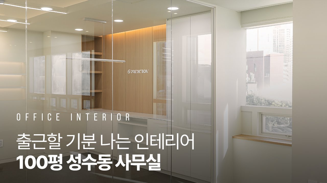 <프리딕션> 기업의 102평 성수동 사무실인테리어. 성수역에서 5분 거리에 위치한 빌딩이며, 직원 연령대가 높지 않아 젊고 트렌디한 감각을 보여줄 수 있는 방향으로 설계를 진행하였습니다. 100평대의 대형 사무실이라 할지라도 공간 분리나 책상 배치를 잘못하면 답답한 느낌을 줄 수 있습니다. 공간 대비 인원이 많은 업무공간이라면 더더욱 '쾌적함'에 초점을 맞추고 레이아웃을 만들어나가야하죠. 김목수이야기는 설계 단계에서 직원 수, 팀장 석의 유무, 대표실 유무 등을 조사하여 기업에 맞는 사무실을 계획하며, 일하는 공간이 편하게 느껴지고 업무와 생활이 조화를 이루는 사무실을 목표합니다.