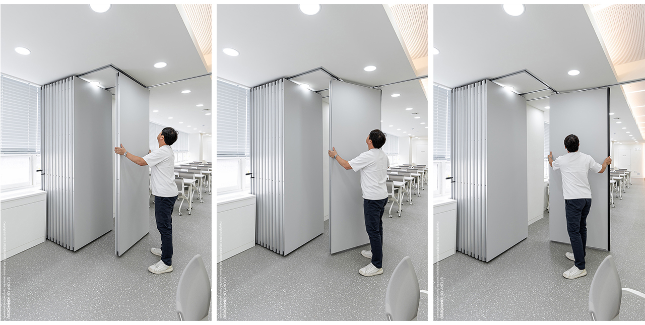입구 파사드와 복도는 제한된 컬러와 자유롭게 배치된 라인 조명으로 현대적이고 간결한 디자인을 보여주었습니다. 반면 카페테리아는 다채로운 색감과 소재를 활용해 자율성을 강조했으며, 바닥에 연출된 곡면 라인은 자연스러운 동선 유도와 공간 분리를 의도하였습니다. 블랙 톤의 노출천장은 그 사이에서 균형을 잡아주고 공간의 입체감을 더합니다. 교육장 중앙에는 '무빙월'을 시공하여 필요에 따라 공간을 분리하거나 확장할 수 있습니다.