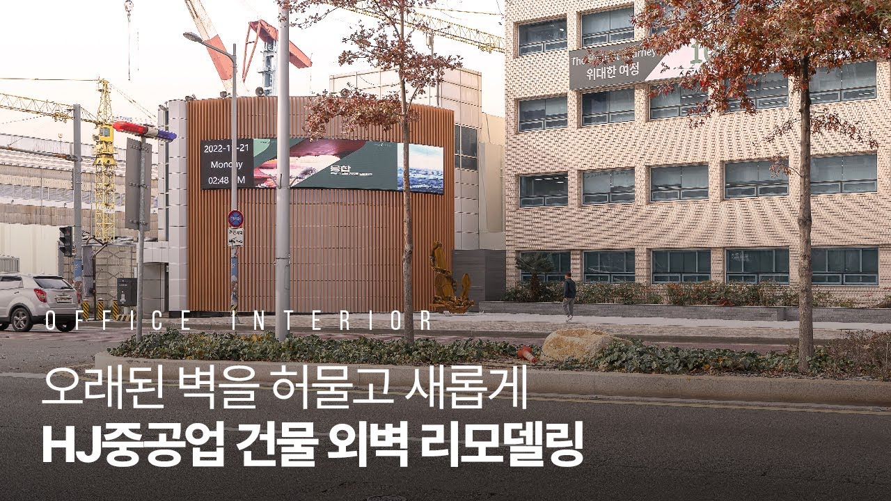 <한진중공업> 영도 사옥의 안내동, 본관 입구, 인포메이션 리모델링 작업 진행하였습니다. 원래 사옥 앞은 높은 옹벽으로 막혀있었고, 전체적으로 연식이 있는 건물이었기 때문에 노후된 느낌이 많이 들었습니다. HJ중공업에서는 사옥 입구에 위치한 둥근 안내실 건물 외벽 공사와, 본관 입구 파사드, 그리고 본관 1층 인포메이션 등을 새롭게 리모델링 하길 원하셨으며 외부 리모델링을 통해 기업 홍보를 할 수 있도록 요청해주셨는데 규모가 큰 공사인 만큼 철저한 준비하에 진행되었습니다.
