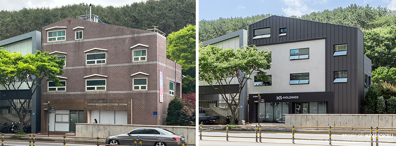 기업 사무실을 준비할 때 가장 먼저 고려하는 것이 사무실 위치에 대한 결정입니다. 보편적으로 많이 선호하는 곳으로 시설 관리 및 서비스가 잘 갖추어진 '지식산업센터'가 있으며 일반 '상가 건물'을 선택하여 자리잡는 기업도 있습니다. 어떤 기업은 비용 절감 및 독창적인 사무 환경을 선호하므로 노후 건물을 리모델링하여 자체 사옥으로 사용하기도 합니다. <KN홀딩스>는 해운대에 위치한 3층 노후 건물을 기업 브랜드를 담은 사무실로 사용할 수 있도록 김목수이야기에 의뢰하였습니다. 노후 건물의 리모델링은 건물 외벽이나 테라스 등 추가적으로 작업해야할 부분이 많지만 다른 기업과 공유되는 공간 없이 독립적으로 사용할 수 있다는 장점이 있습니다.