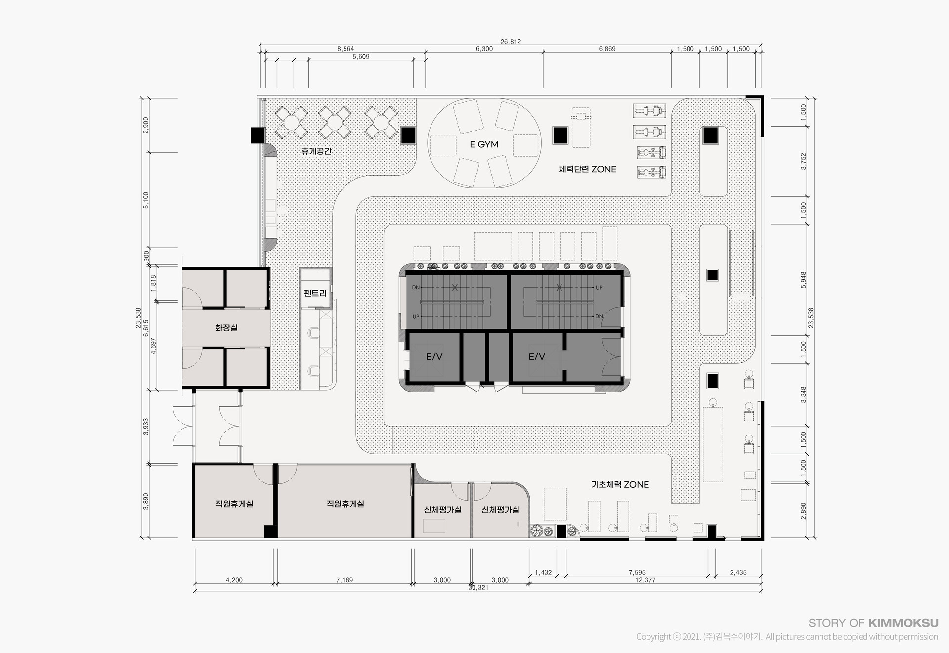 구 성 인포데스크, 신체평가실, 직원휴게실, 연구실 등