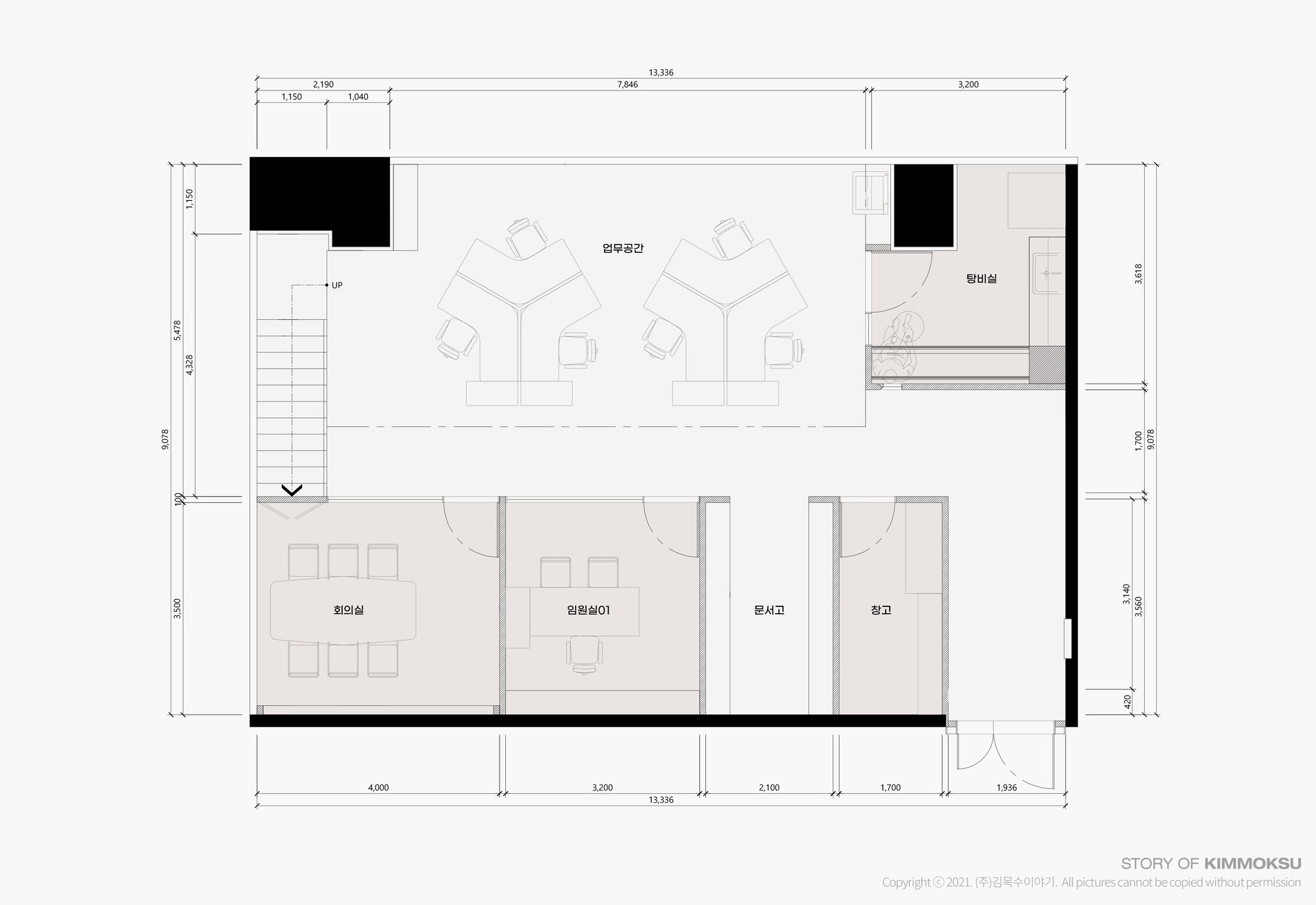 구 성 업무공간, 회의실, 임원실, 탕비실, 문서고, 창고