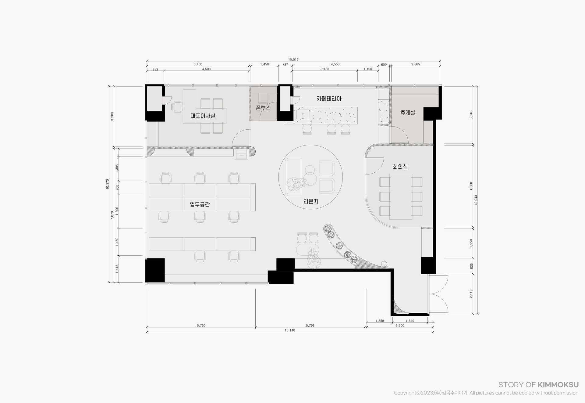 구 성 업무공간, 라운지, 대표이사실, 카페텥리아, 폰부스, 휴게실, 회의실