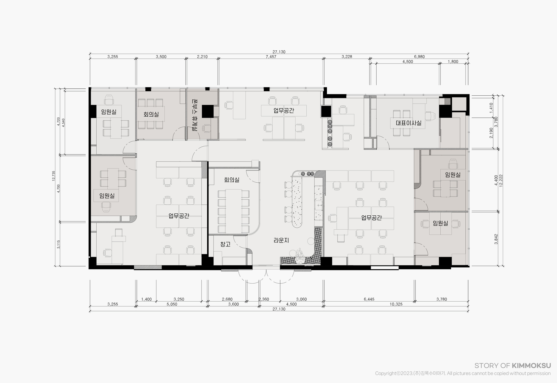 구 성 업무공간, 라운지, 임원실, 회의실, 대표이사실, 솔로부스