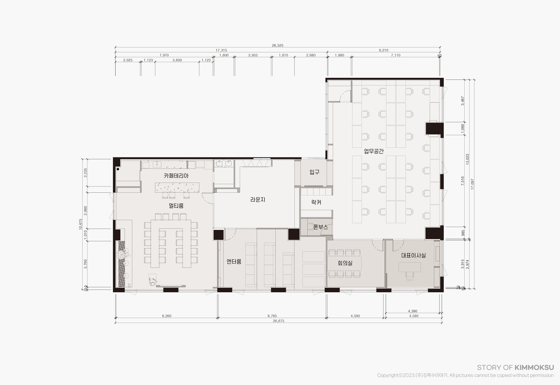 구 성 리셉션, 업무공간, 상담실, 오픈상담실, 회의실, 탕비실, 창고, 전화부스, 휴게공간