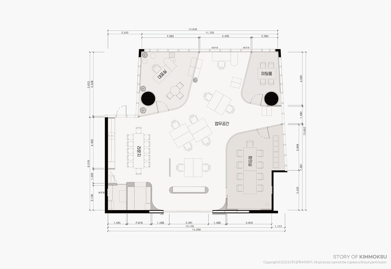 구 성 업무공간, 카페테리아 라운지, 회의실, 대표실,