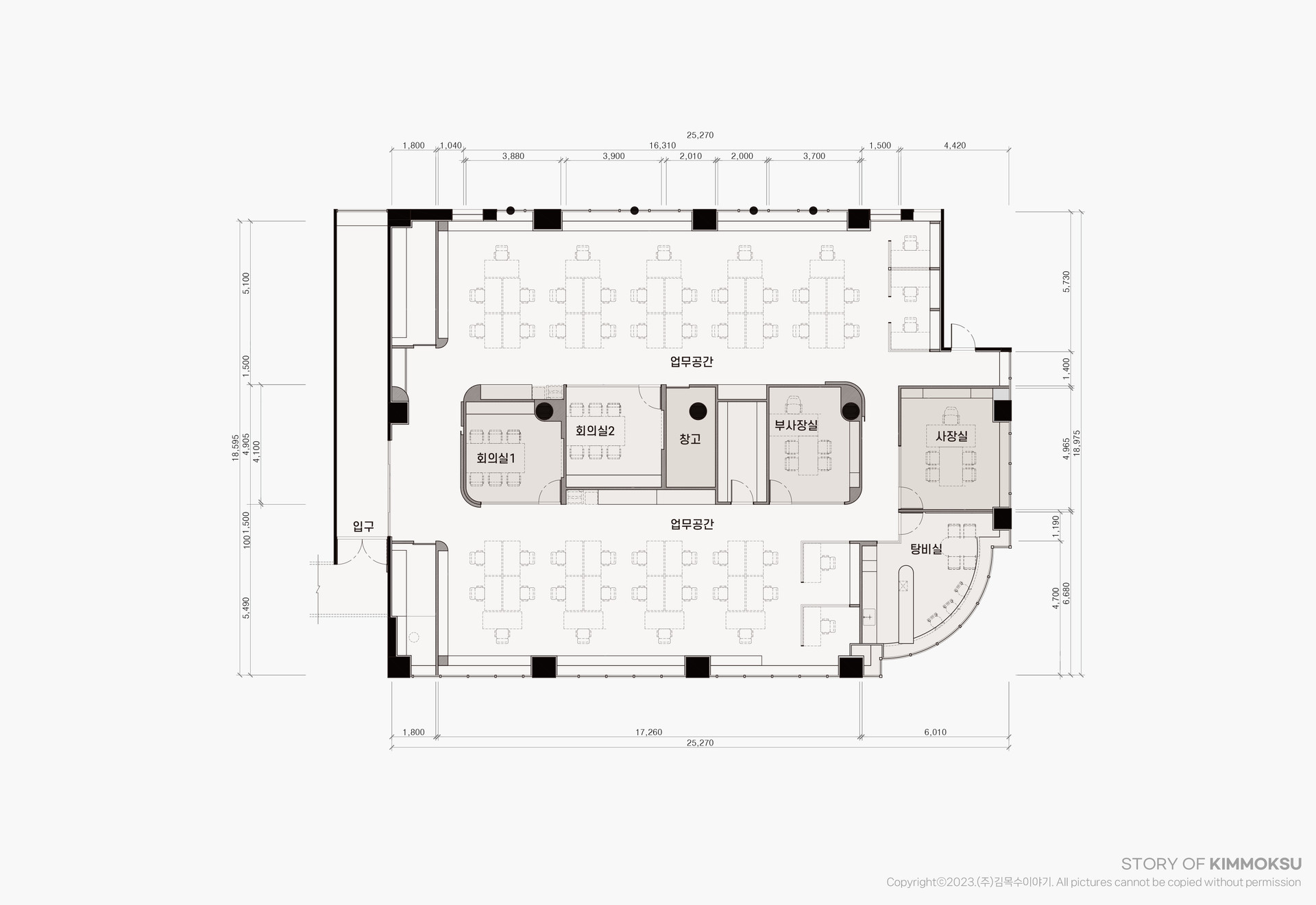 구 성 업무공간, 회의실, 부사장실, 사장실, 탕비실, 접견실, 휴게실, 대회의실