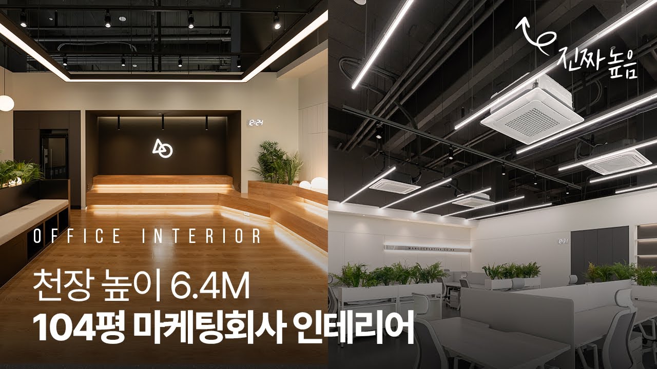 마케팅 전문 그룹 '망고 크리에이티브'의 사무실 인테리어를 소개합니다. 이번 프로젝트의 가장 큰 특징은 바로 6M에 달하는 높은 천정고로, 104평의 넓은 공간을 더욱 돋보이게 합니다. 클라이언트의 요청에 따라, 입구에는 손님들이 처음 들어섰을 때 가장 먼저 반겨주는 라운지 공간을 구성했습니다. 이곳은 고객이 방문하면 자연스럽게 미팅 공간으로 이어지는 동선으로 설계해 직원들의 업무에 방해가 되지 않도록 하였습니다. 클라이언트의 니즈와 기업 브랜드 이미지가 자연스럽게 녹아든 이번 사무실은 블랙&화이트 조합이 깔끔하고 현대적인 분위기를 자아내고 있으며, 천장의 개방된 부분은 블랙으로 마감하여 높이가 과도하게 도드라지지 않도록 하였습니다. 클라이언트가 가장 중요하게 생각한 라운지 공간에는 계단식 의자와 바닥이 우드 마루로 자연스럽게 연결되도록 디자인했습니다. 생기를 더하는 플랜테리어 데코로 마무리하여 망고 크리에이티브만의 편안하고 자유로운 활동 공간을 완성하였습니다.