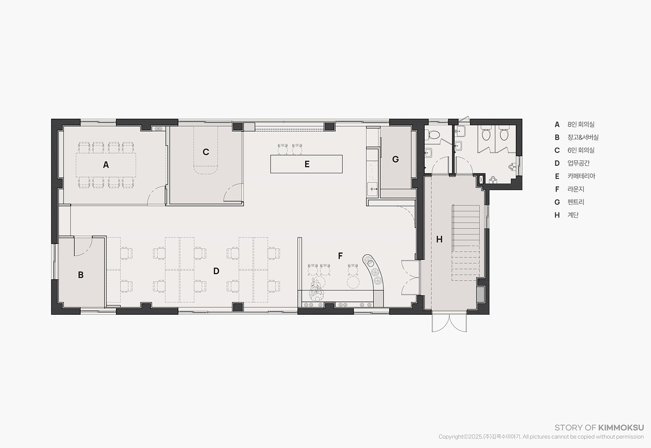 구 성 라운지, 카페테리아, 업무공간, 회의실, 대표실,