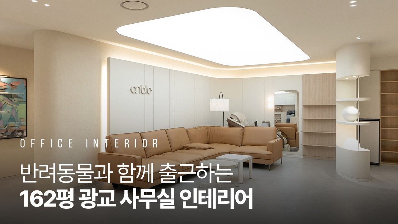 반려동물 헬스케어 브랜드 ANBIO의 광교 사무실은 162평 규모의 공간으로 'ㄱ'자 형태로 꺾인 구조와 지그재그로 이어진 창문 라인이 특징입니다. 이러한 구조적 조건은 설계에 있어 유연한 해석이 필요했으며, 김목수이야기는 이 요소들을 인테리어에 자연스럽게 담아내고, 조화롭게 풀어내는 것에 집중했습니다. 입구 정면의 아트월은 내부가 바로 노출되지 않도록 가려주는 동시에 진입 동선을 유도합니다. 여유로운 면적의 라운지 공간에는 소파, 안마의자, 게임기 등을 배치해 직원들이 자유롭게 휴식을 취할 수 있도록 구성했습니다. 바로 옆 카페테리아의 공간 포인트는 아일랜드 테이블과 벽면을 마감한 박판 타일로, 고급스러운 마블 패턴이 전체 공간에 고급스러움을 입혀줍니다. 대표실은 독립된 룸 형태로, 업무용 책상과 소규모 회의 공간이 있는데 벽면에서 천장까지 연결되는 일체형 우드 패널이 공간 안에서 또 하나의 존(zone)을 형성합니다. 또한 대표님의 미술 소장품들 사이즈를 사전에 실측하여 설계 과정에서 전시 위치를 계획해 드렸습니다.